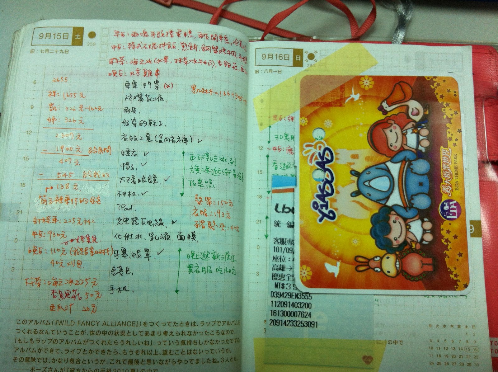 九月中時,跟好友及姊妹們一同到高雄義大世界玩,是個美好回憶喲~~票券好可愛,當然也是蓋了章,只是不知丟哪去了。很可惜的是只有兩天的空白可記事,小小可惜呀~ |