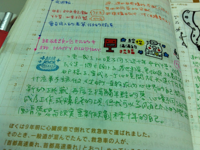 9/21 生日時,寫下生日的小小感言,記得十年前的自己與目前的自已做個對照,有很多的成長,心境也變得很開放,年輕的夢想也慢慢的在實現,只是夢想要築步踏實的去實現,這中間是很辛苦的!希望未來的十年也繼續努力,十年後再回來看自己能抱著不悔的心態^^