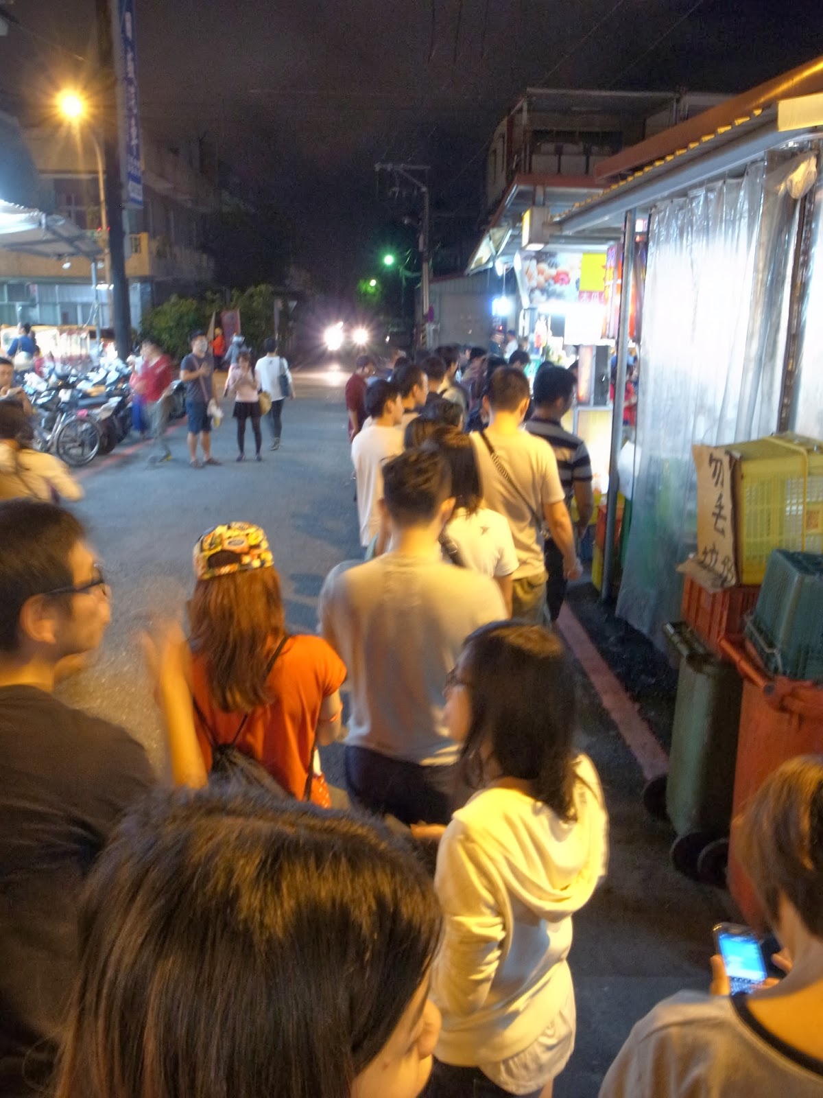 吃完了棺材版,又吃了烤干貝、烤魷魚、烤香腸,這類的夜市小吃,吃得差不多時開始排隊等果汁。結帳時老闆還說我眼睛漂亮,真開心!我點了一杯香蕉牛奶,豬頭點了一杯草莓蘋果汁,但不停的喝我的香蕉牛奶,直呼好喝。