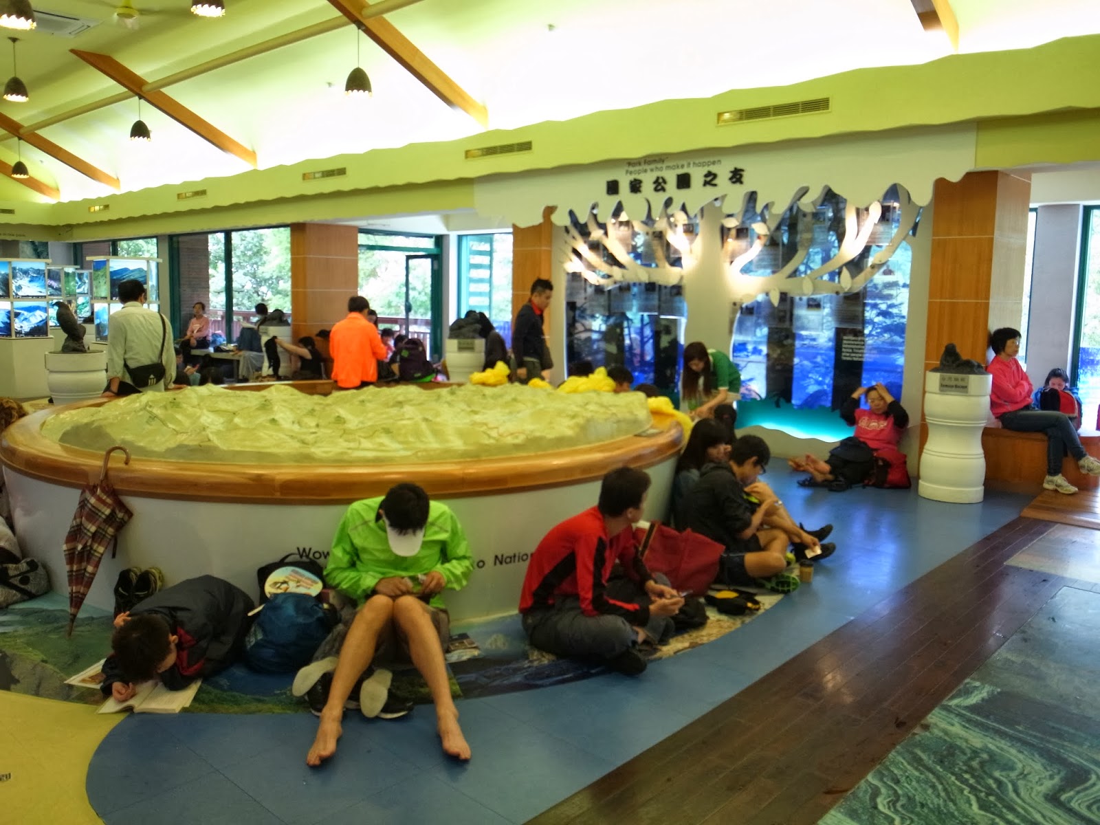 離開跑前5分鐘,我跟豬頭 say goodbye,就走到牌坊附近,準備到旅客活動中心休息。走上去休息才發現我太晚來啦!因為早就人滿為患,而且親友們都幫比賽的人佔位子,於是乎變成有坐位沒辦法坐,一堆人開始坐在樓梯間、導覽室的椅子上…無所不用其極的都是人啊啊啊!最好睡的位子則是在脫鞋可以進去的展覽室,兒童閱讀間等等,這些地方真的是補眠的好去處。