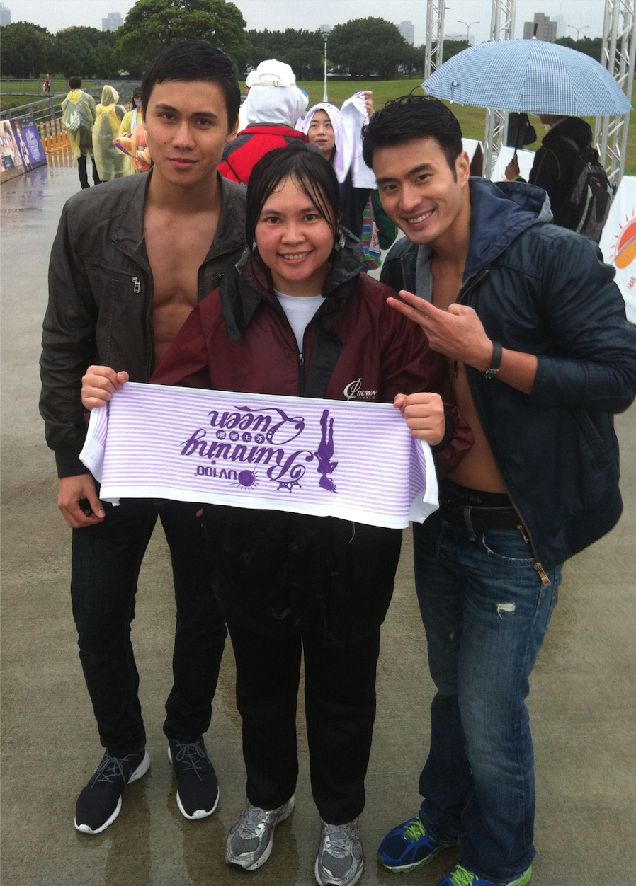 回到現場後看到有露出八塊肌的帥哥模特兒在跟大家合照,我跟欣欣也興奮的跑去合拍,話說 Nike Woman Run 也有同樣的儀式,由模特兒掛牌子,真是了解女人心。另外也有下午茶,宴會茶點可以吃,還準備了熱熱的薑母茶,算是滿有誠意的。比賽的攤位滿多的可以逛逛,不過比較可惜的是有些店家沒出來擺攤,可能是受到下午的影響吧。
