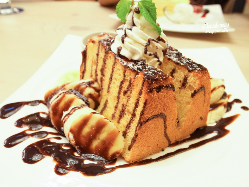 再來我點的是巧克力香蕉戚風蛋糕,跟剛剛的奶酪比起來整個份量就比較足夠,總算展開笑顏啊!除了香蕉跟巧克力還有奶油的裝飾。蛋糕非常的綿密,味道在嘴巴裡慢慢的化了開來(這友人形容的) |