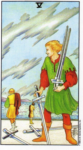 寶劍五也可以代表敵意。這場爭執不像權杖五,起碼是個公平的競賽。寶劍五的爭執中,很可能有人會刻意傷害對方,甚至不擇手段,以贏得最後的勝利。在爭鬥的過程中,寶劍也可能刺傷參賽者的肉體。參賽者可能短視近利,忘記了比賽最終的目的,只是為得勝而得勝,甚至是為了把對方打敗而得勝。因此當寶劍五出現時,需審視週遭有沒有對你懷有敵意的人,對你做出傷害性的行為。這種傷害不一定是身體上的,光是謠言就形同利刃。