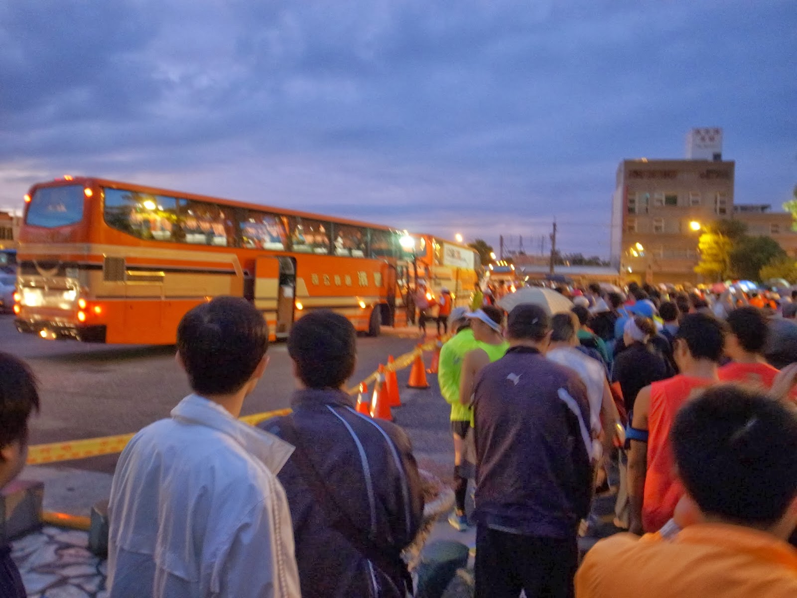 隔天一大早就到花蓮車站,除了我們也看到陸續有人穿著這次的比賽衣服到車站搭車,準備前往新城火車站,到了新城火車站後,人山人海的好不容易擠出站了,在天空才浮著魚肚白時,看到車站前的廣場擠滿了排隊要上接駁車的人海。這次主辦單位安排了親友也可以搭車的乘車券,不過要用買的,來回100元,每個人都必須先先給票券,參賽者則是看號碼牌就可以上車。排在我們前方的一對男女,正躊躇不安的看著我手上的乘車券,後來開口說他們有繳錢但沒有收到乘車券,很擔心上不了車,後來好像是被擋下來安排到另一個要購票的排隊隊伍了。記得前年參加的朋友一直跟我說很亂不會看,還好我有買乘車券,不過後來發生了一件蠢事…這就留到後面說好了。
